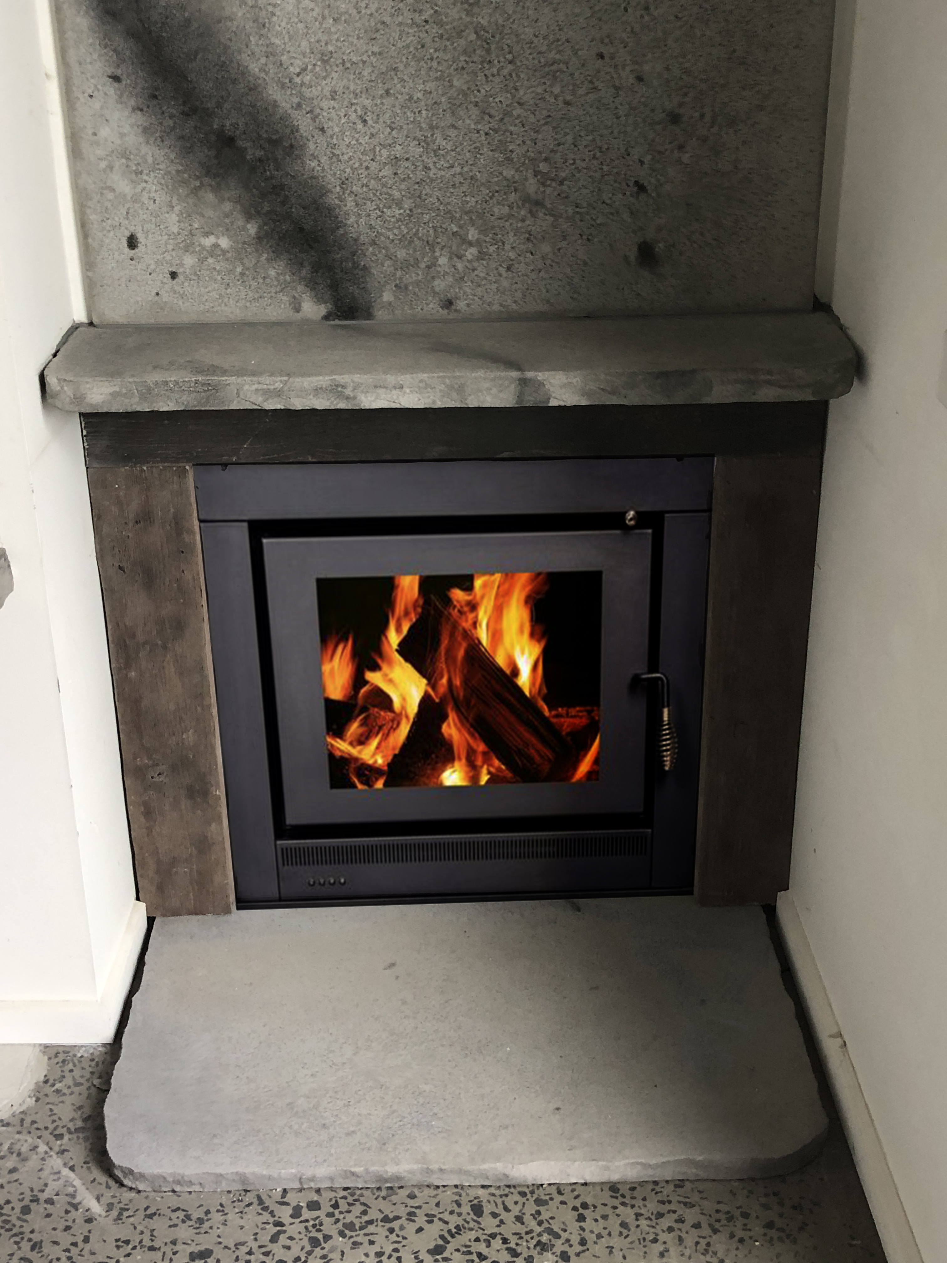 Custom live stone edge mantles, two styles several colour options. Solid recycled timber mantles and surrounds.